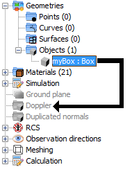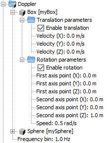 In the PO and GTD modules, the user is able to add doppler parameters to an object. This task can also be done with drag and drop by clicking and dragging the object node and dropping it into the “Doppler” node.The children nodes of the “Doppler” node will represent all the objects with doppler in the current project. This node will also allow the user to modify the doppler parameters for each object (i.e the translation parameters and the rotation parameters, as well as the global parameter “frequency bin”).