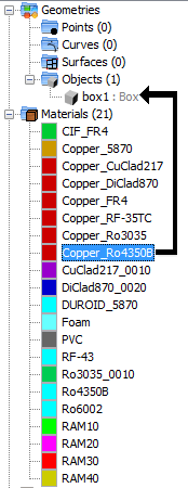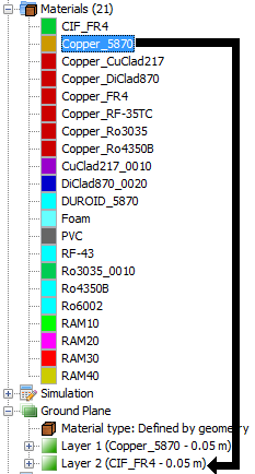 In the PO and Moncros modules, it is possible to assign a material to a ground plane defined by geometry. To do this, the user needs to drag a material node and drop it into the node that represents the ground plane layer. The user can modify the thickness of each layer from the tree.