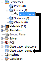 In the Moncros, GTD and MOM modules, the user is able to extract points from a curve or surface to create a set of observation points used for the analysis of the near field. To do this using the tree, the user needs to drag a curve or surface node into the “Observation points” node. Doing this will show a dialog prompting the user to specify the number of points that will be sampled from the selected curve or surface.