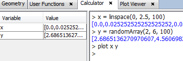 Click on Tools - Calculator menu. Invoke any user function that return an array of values, and the use the plot sentence to visualize the values in the Plot Viewer, as shown in next figure. Remember that an user function file with the considered functions is required for this example, as mentioned in the introduction section.