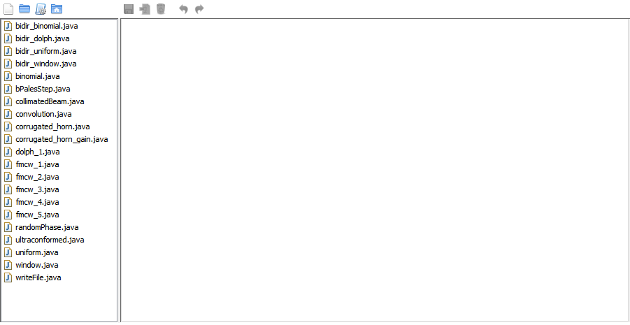 This is the User Functions Editor. On your left, there is a sidebar with the different Java files currently registered in newFASANT. There is a main container where the editor will appear once a file is opened. At the top, a toolbar lets you perform several actions on the files or on the opened user functions.