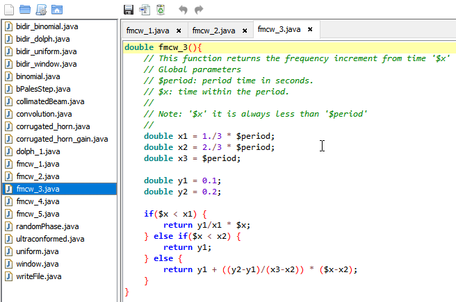 To open a user function, double click it from the sidebar, or click it on the sidebar and then press the Open User Function button in the toolbar. This will display the file in the editor. The editor can keep multiple files opened at the same time.