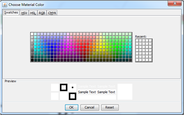 The box shows the currently selected color for the material. Left-clicking the box will originate the Choose Material Color dialog, which allows the user to select a color in a variety of color modes: