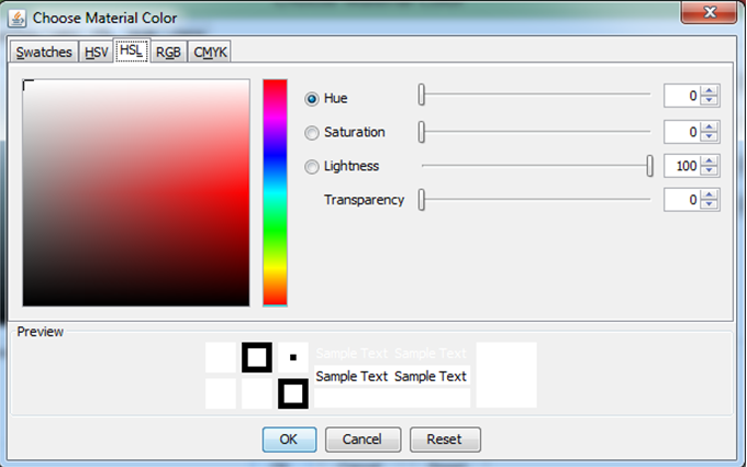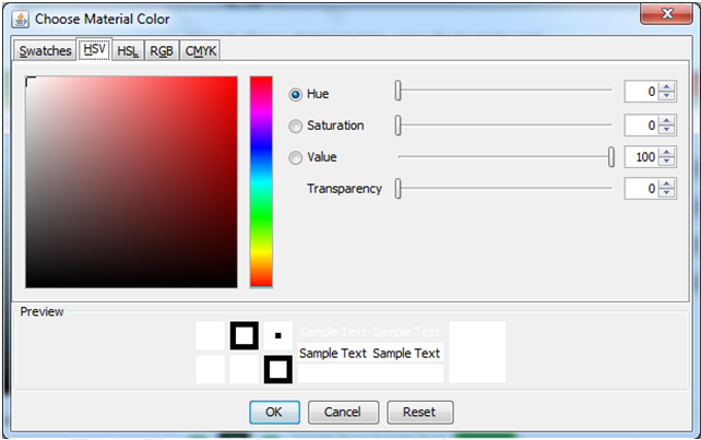 - In this tab the user can pick a color specifying its hue, saturation, and value (HSV) properties. The user can also specify a transparency or alpha value for the color.