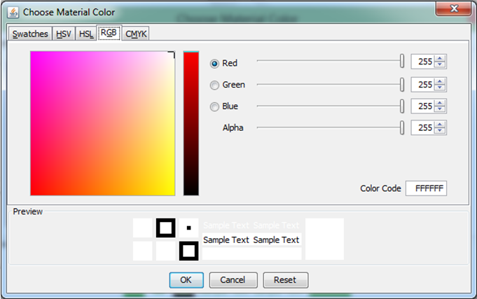 - This tab allows the user to pick a color specifying its RGBA (red, green, blue, and alpha) components.