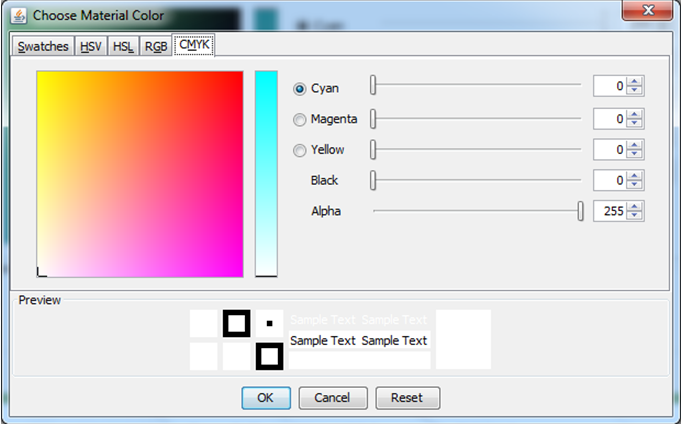 - This tab allows the user to pick a color specifying its CMYK (cyan, magenta, yellow, and black) components, and also an alpha component.