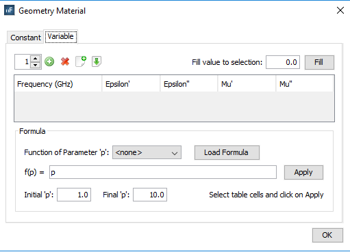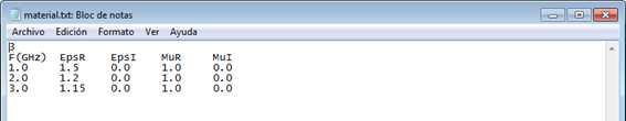 § Frequency (in GHz): Sets the associated frequency to the physical properties. The frequency values for each material are interpolated when the simulation is launched in order to use the most suitable one for the working frequency.