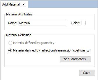 Currently, the only possibility is the creation of materials given by their reflection/transmission coefficients. In this panel, the user can set the name of the new material, as well as the color. To set the color, the user needs to double-click the box next to the "Color:" label. For more information about setting a material's color, check APPENDIX A: Color Selection.
