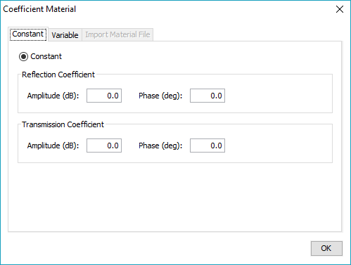 - Constant coefficient materials These are materials with reflection and transmission coefficients that are constant (not depending on frequency nor angle of incidence). To define this kind of material, it is necessary to check the "Constant" option under the "Constant" tab and introduce the complex values of the coefficients. Please note that the amplitudes of the coefficients cannot be larger than 1.