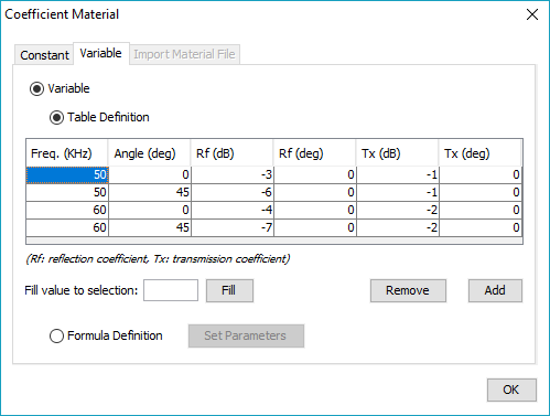 - Table definition This mode of creating variable coefficient materials allows the user to manually specify the reflection and transmission coefficient for different frequencies and angles of incidence. To add and remove rows, the user needs to use the "Add" and "Remove" buttons located below the table. The user can edit the content of the cells of the table directly. However, it is possible to bulk update the value of multiple cells at once. To do that, the user needs to select the cells of the table, introduce the value in the "Fill value to selection" field and then press the "Fill" button.