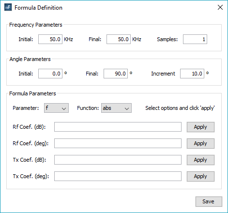 - Formula definition This mode allows the user to specify formulas used to generate the values of the amplitudes and phases of the coefficients. In the formula definition mode, the user needs to set a sweep of frequency values and a sweep of angle of incidence values, used to generate the data points where the formulas will be evaluated. The user also needs to specify the formulas for each of the amplitudes and phases of the coefficients. The available parameters and functions are shown in the drop-down lists at the top of the "Formula Parameters" panel. The "Apply" buttons next to the formula boxes allows the user to add the function to the formula.