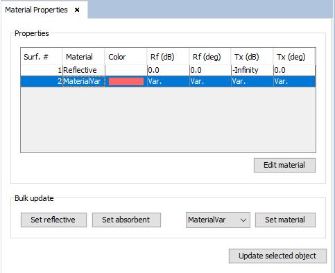 The "Set reflective", "Set absorbent" and "Set material" buttons allow the user to bulk-assign a material to multiple surfaces (to select multiple surfaces in the table, hold the Ctrl key while clicking surfaces). The "Set material" allows to assign a user-defined material to one or multiple surfaces. The material that is assigned corresponds to the one selected in the drop-down list next to the button.