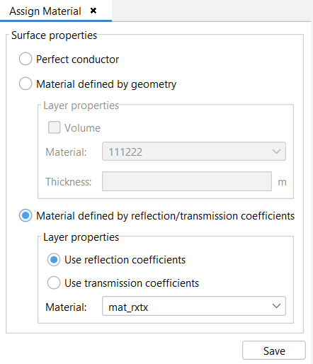 This option allows the user to assign existing materials to objects and surfaces previously selected from the geometry tab. Selecting this option shows the following panel on the right side of the screen.