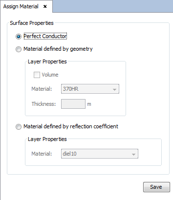 - This option allows the user to select a custom material and a thickness value for the selected objects and/or surfaces. If the ‘Volume’ option is selected, the objects (not surfaces) will be transformed to a volume and this property will be considered for the meshing and simulation.