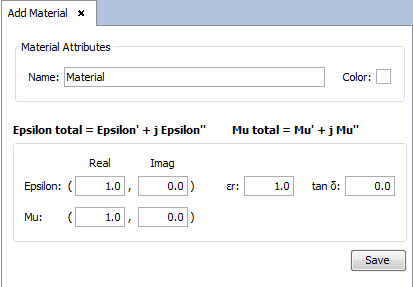The user should modify the Epsilon (permittivity) and Mu (permeability) values associated with the material, specifying their real parts (on the left text field) and imaginary parts (on the right text field), or the loss tangent and relative permittivity values. Common real parts for these values are greater or equal to "1.0". Additionally, materials with positive imaginary parts are considered to have gains, while materials with negative imaginary parts are considered to have losses.