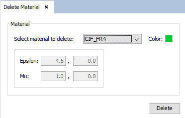 The user needs to select the material to delete in the "Select material to delete" dropdown menu. The properties of the selected material, that is, the material color and the Epsilon/Mu values, will be shown in this tab. If the user wants to delete the selected material, they only need to click the "Delete" button. Note the material deletion cannot be undone.