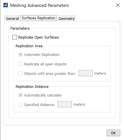 - Replicate Open Surfaces Select this option to activate the replication and the to enable rest of parameters in the window. If replication is enabled, the elements of the open objects are replicated to an automatic frequency-dependent distance from the original ones.