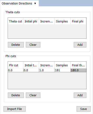 Insert Theta or Phi cuts by clicking on the Add buttons of the corresponding section, and remove undesired cuts by using the Delete buttons. Clear buttons removes all cuts from table.