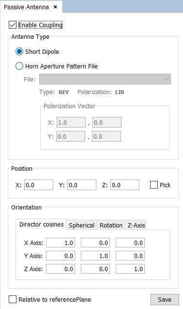 - Position-Coords location of the passive antenna (from the keyboard or using the mouse with ' Pick Point Edition' option).