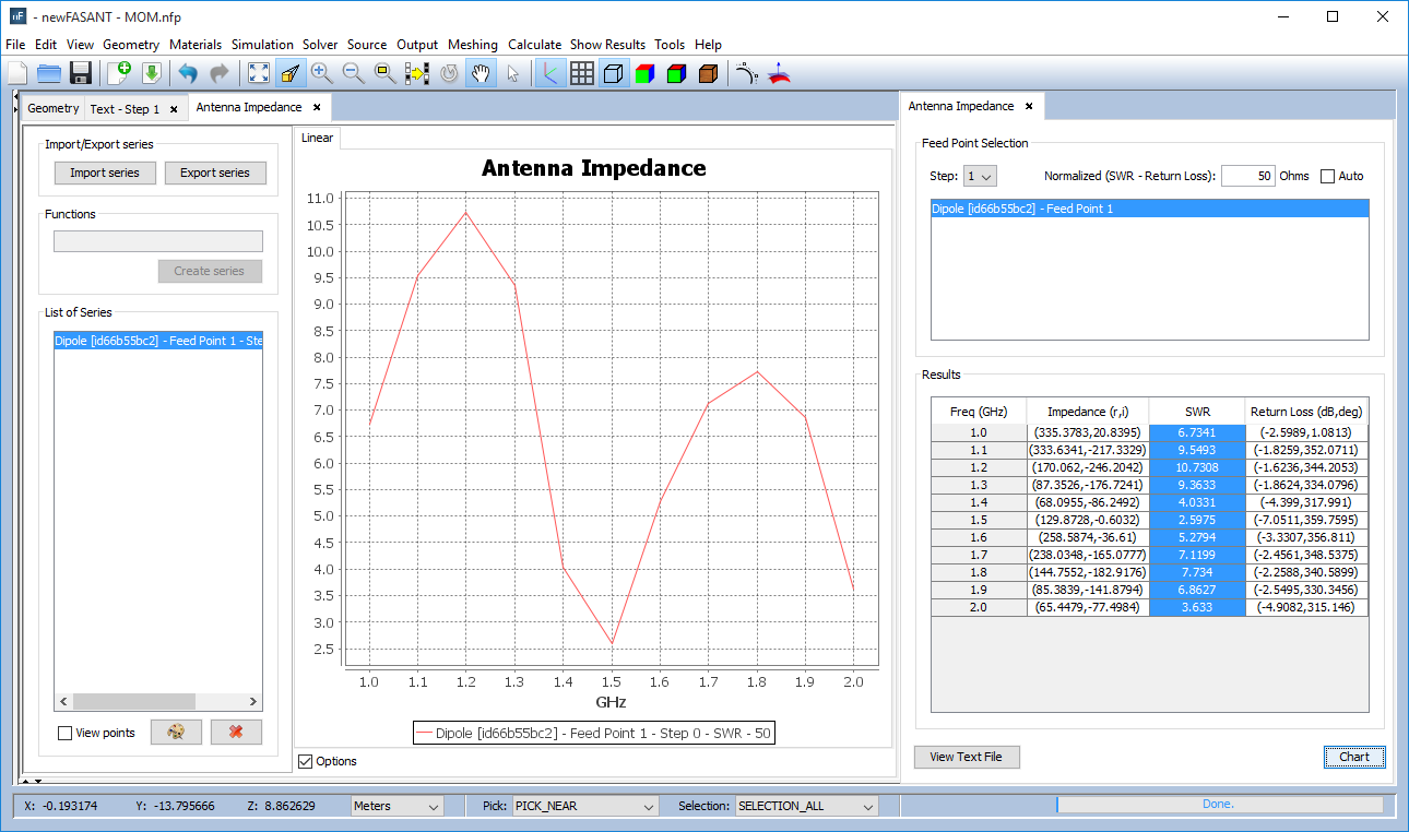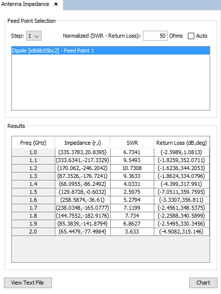 With this option, the user can visualize the calculated impedance results for each antenna and for each user defined frequency.