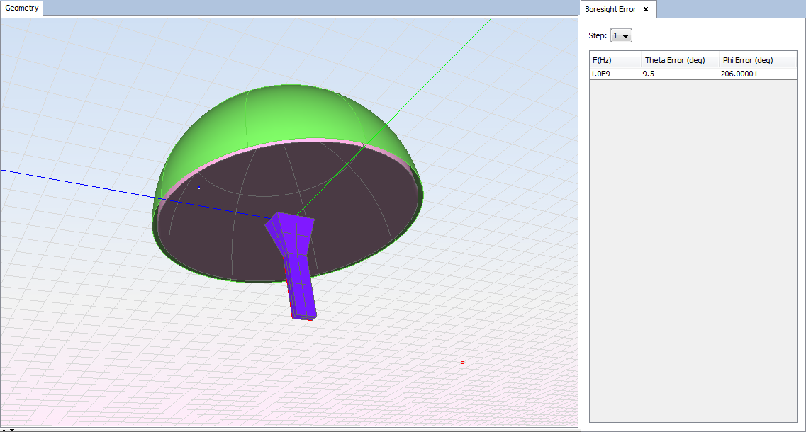 This option allows the user to visualize the values of the Boresight Erroronly on simulations with some radome defined and the Calculate antenna results option activated on the radome definition window. User can see the Boresight Error values for all frequencies of the selected simulation step.