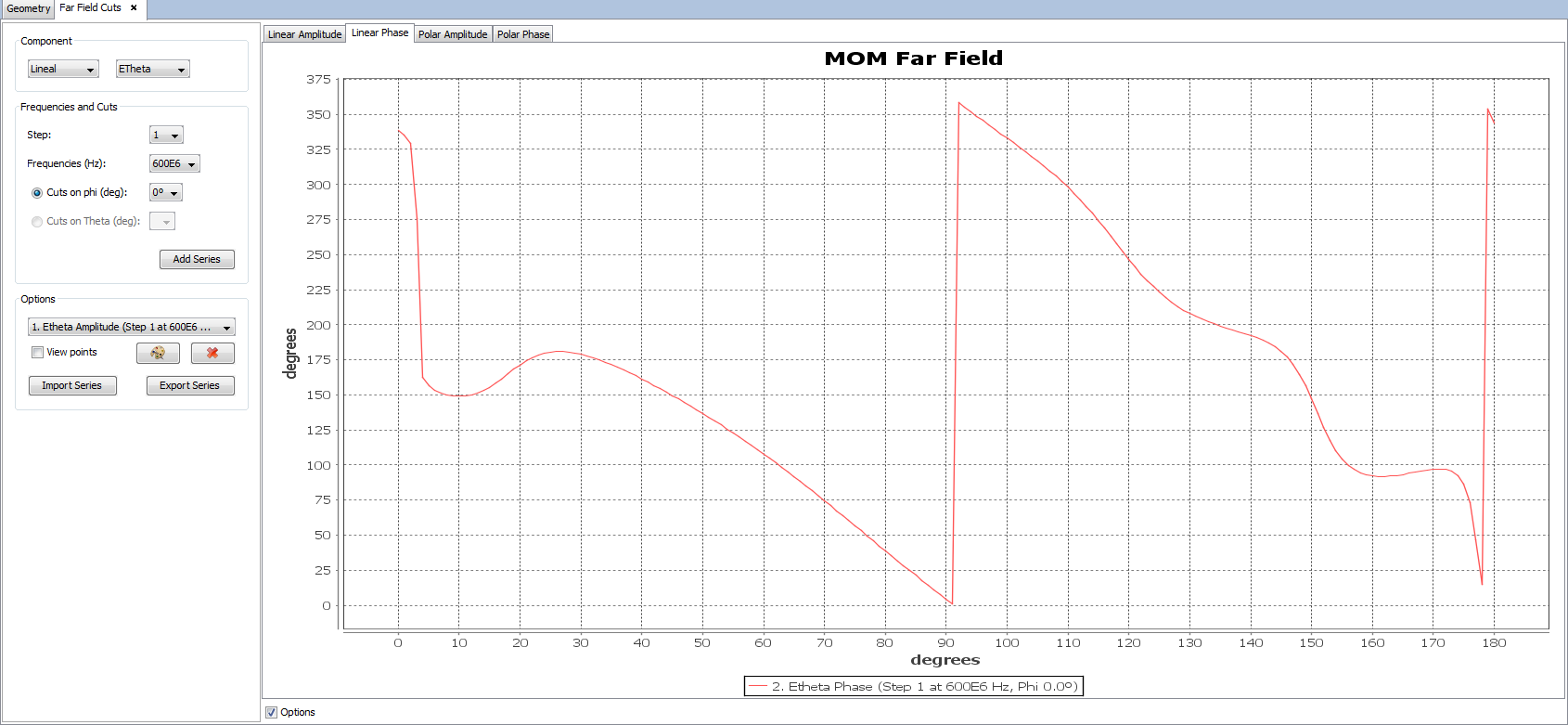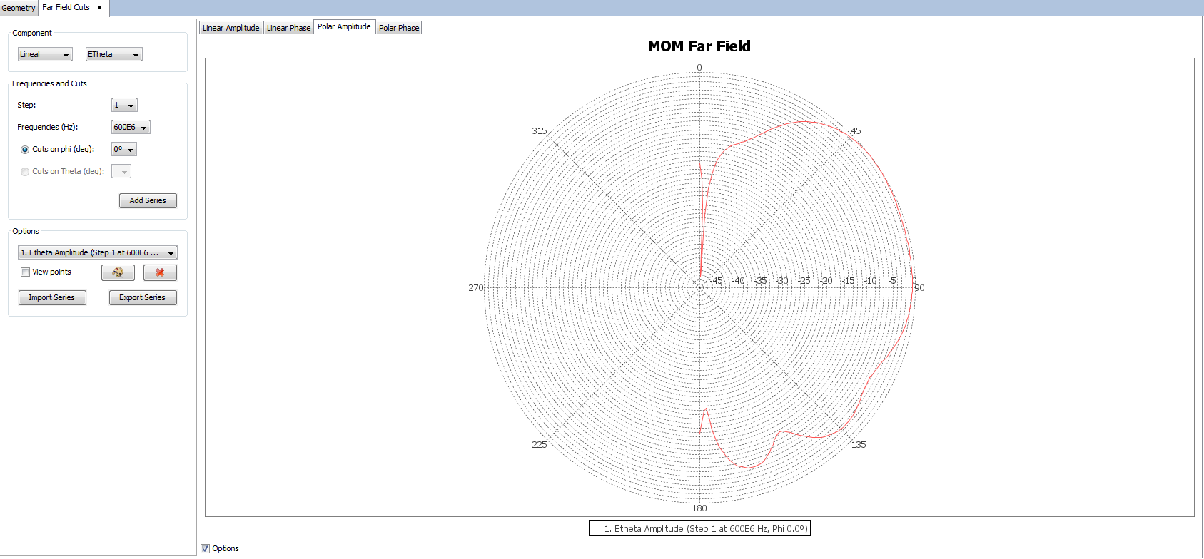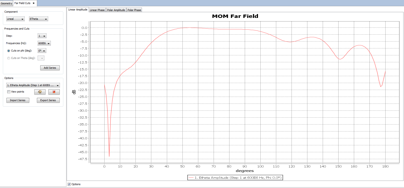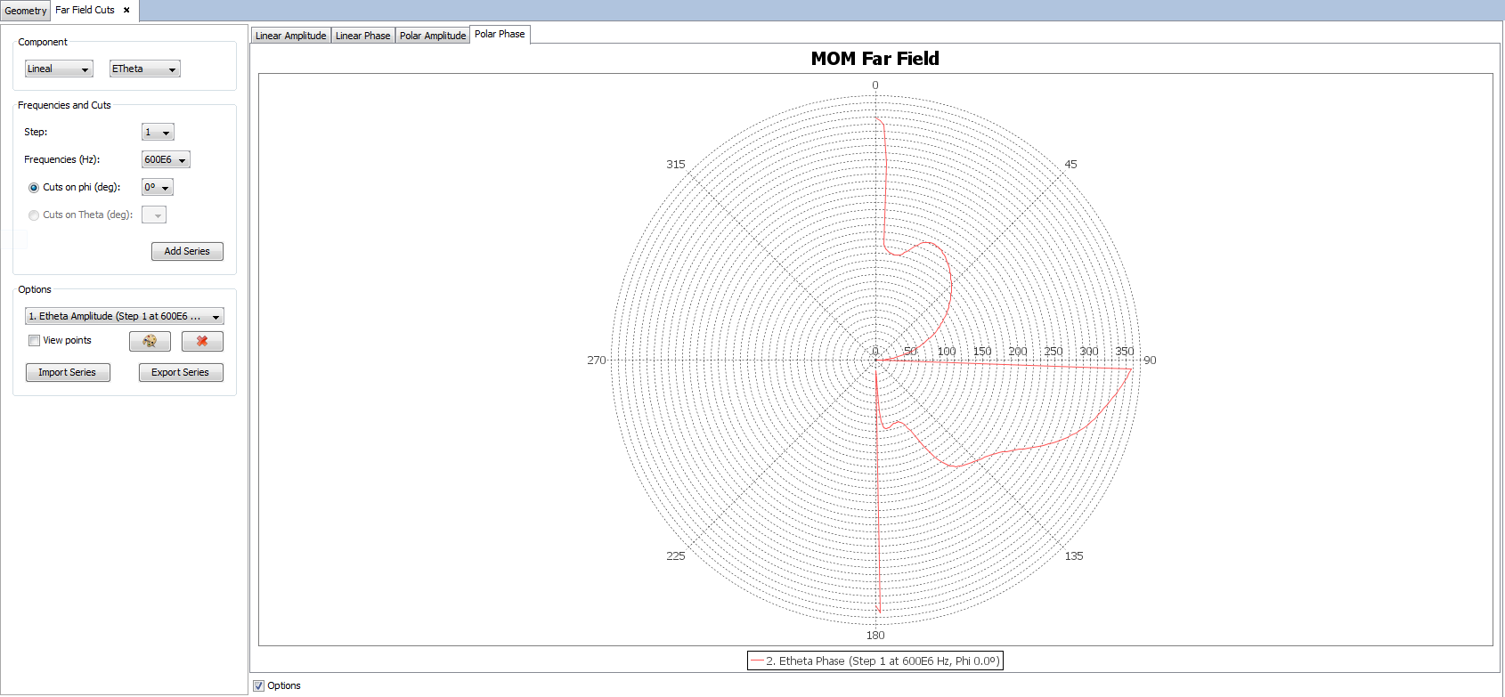 The user can also switch between the linear graph and the polar graph to visualize far field results. It is possible to visualize the Linear Phase, Polar Amplitude and Polar Phase by clicking on their respective tabs.