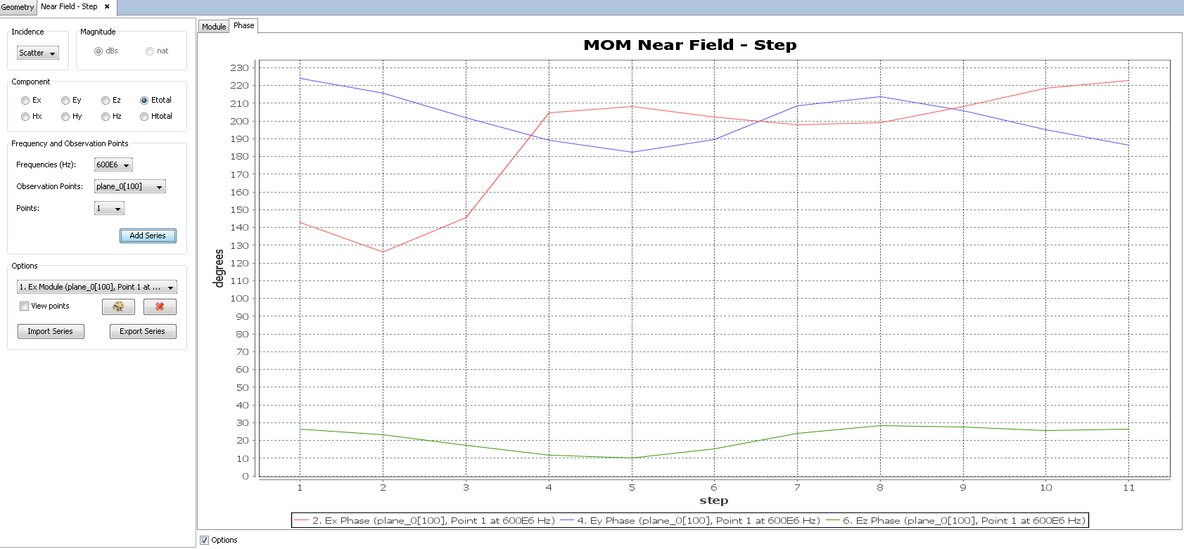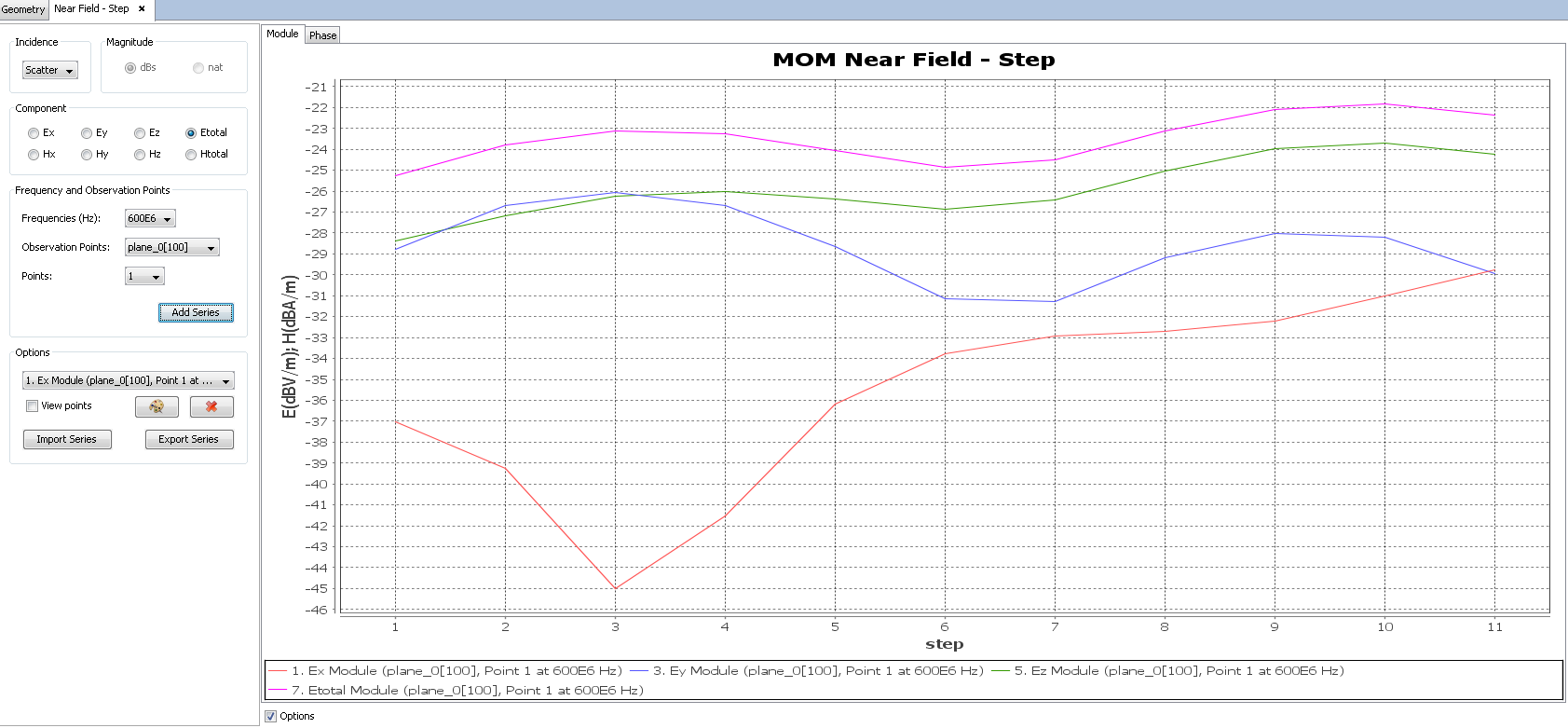 - List of Series All the plotted field components are listed. Note that two options are included for every plot for most of components both the amplitude and the phase. However, ETotal and HTotal only represent the module.