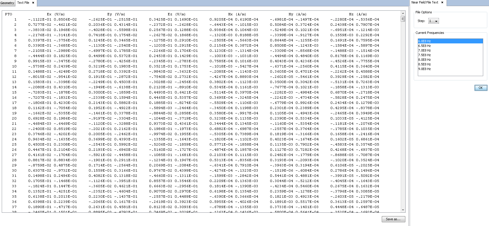 The values of the near field components on the observation points may be visualized and exported as a text file within this menu. When click on this option, a new tab-panel is opened on right side with some options to select the results to visualize: