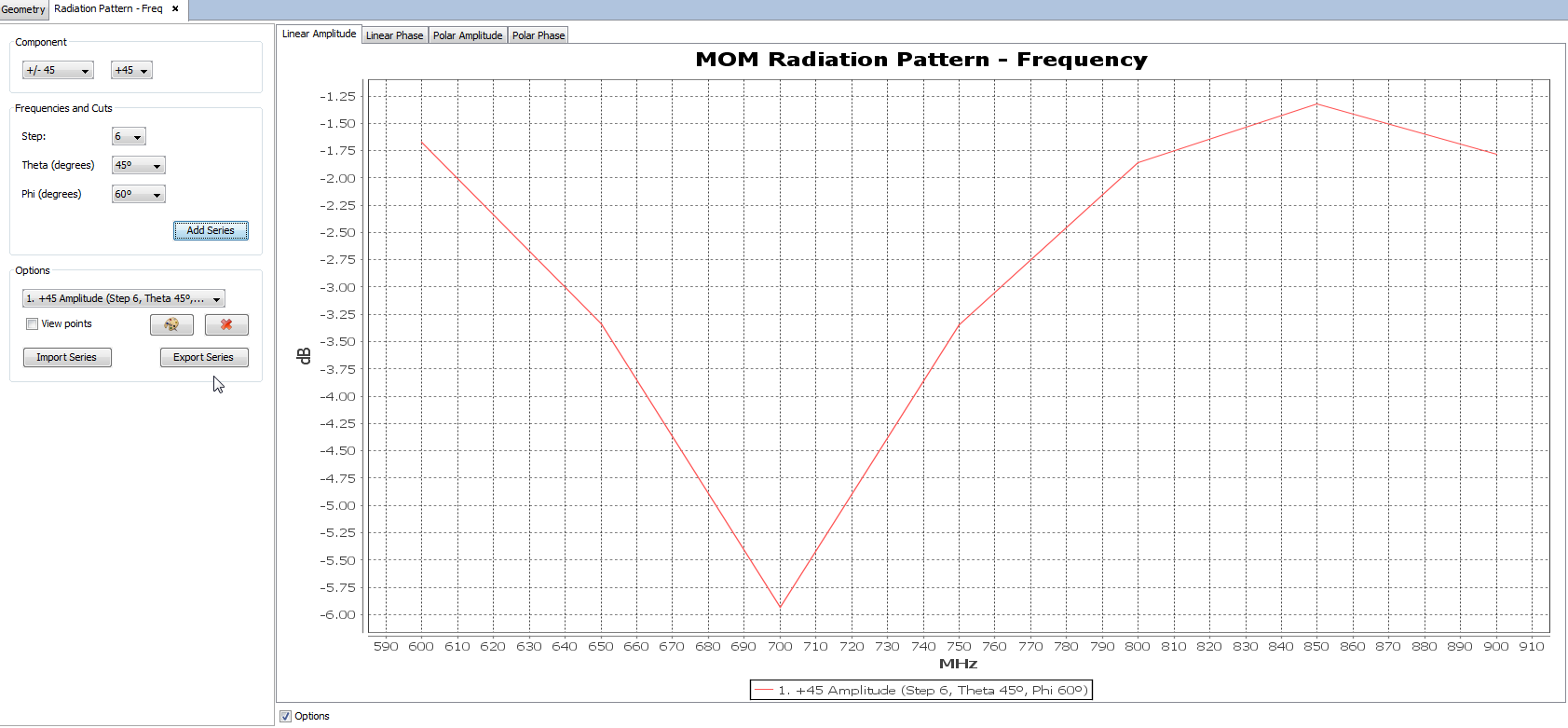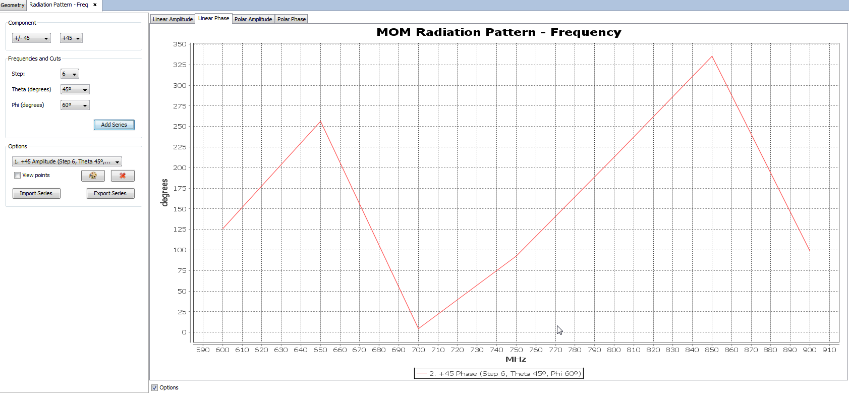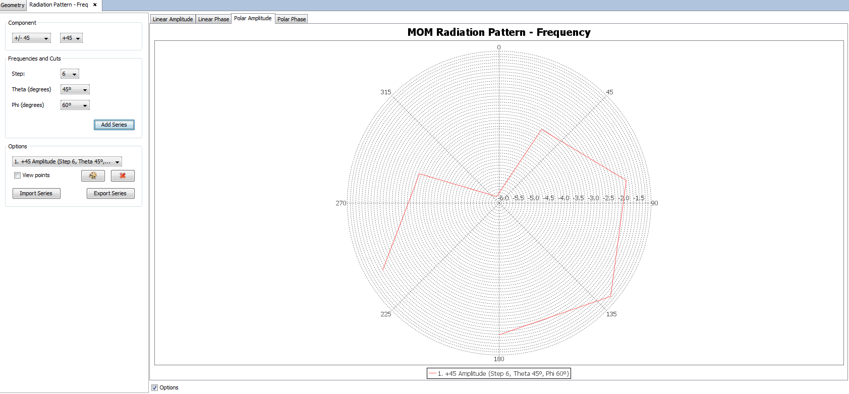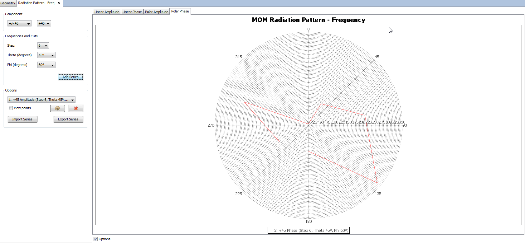 The user can also switch between the linear graph and the polar graph to visualize far field results. It is possible to visualize the Linear Phase, Polar Amplitude and Polar Phase by clicking on their respective tabs.
