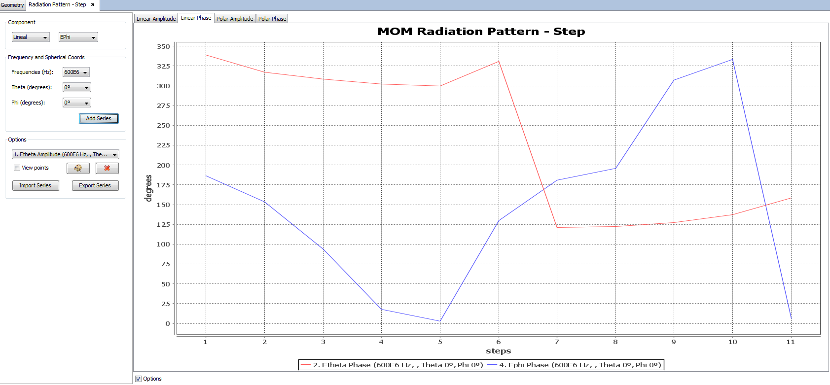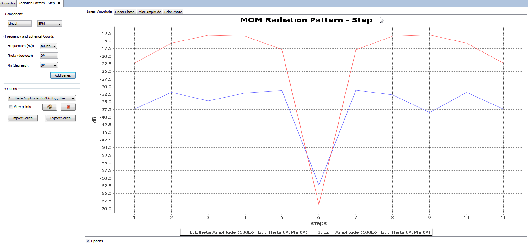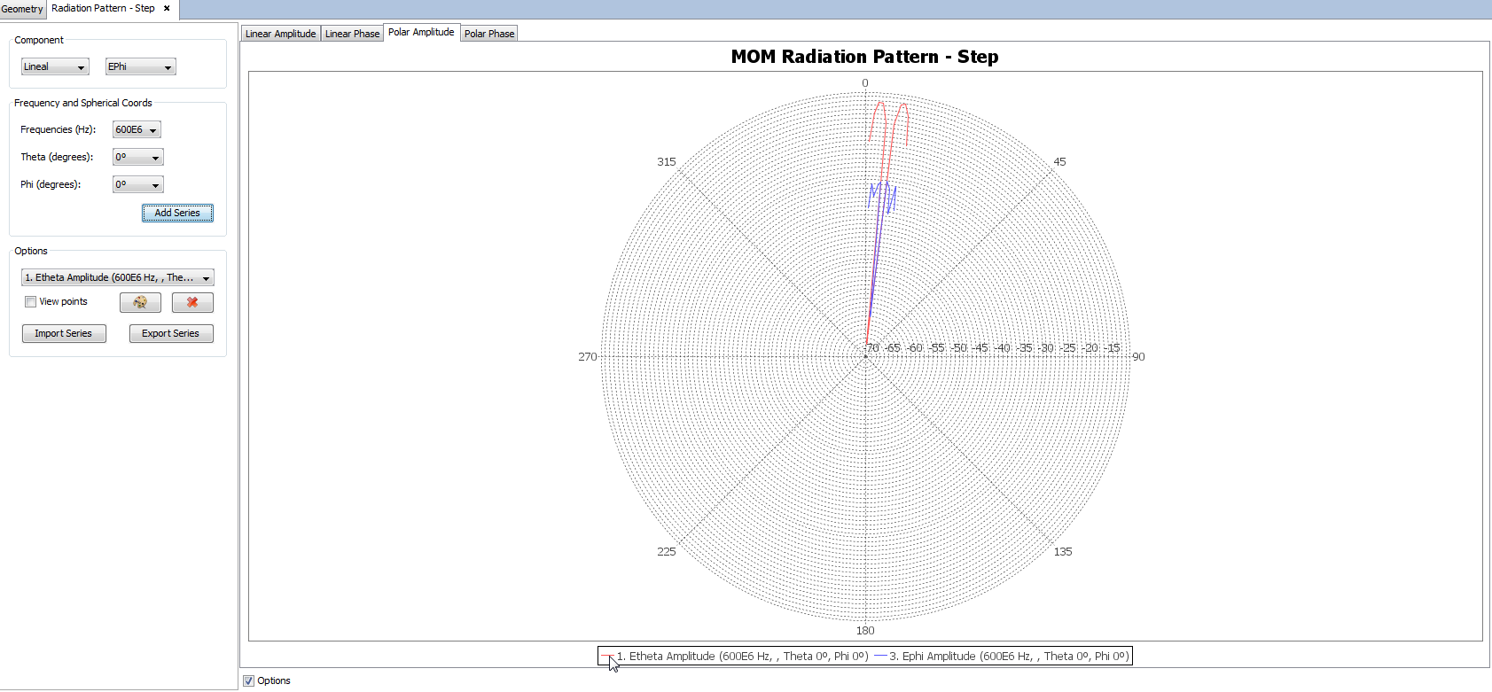 The user can also switch between the linear graph and the polar graph to visualize far field results. It is possible to visualize the Linear Phase, Polar Amplitude and Polar Phase by clicking on their respective tabs.