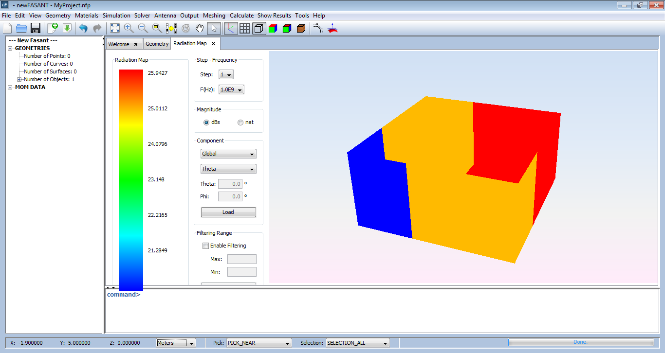 - nat The radiation map is represented in natural scale, given in Volts per meter for electric field.