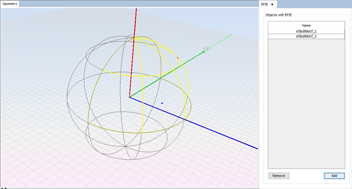 This option opens a table list with all the names of the objects that are going to be analyzed with EFIE. Selecting the objects on the geometry panel and clicking on Add button, the object names are added to the Objects with EFIE list. Use the Remove button to delete objects from the list.