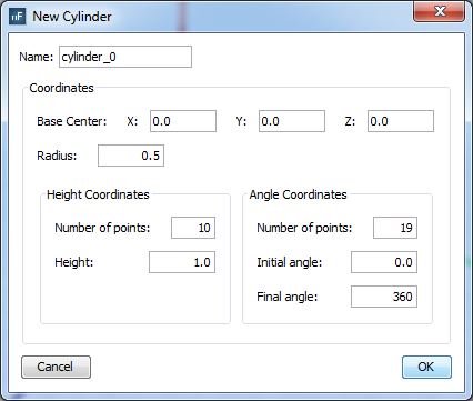 Select 'Output --> Observation Points' option. To add a cylindrical visualization, select 'cylinder' on the selector of 'Geometry Types' section and click on 'Add' button. The cylinder parameters panel will appear, then configure the values as the next figure show and accept it clicking on 'OK' button.