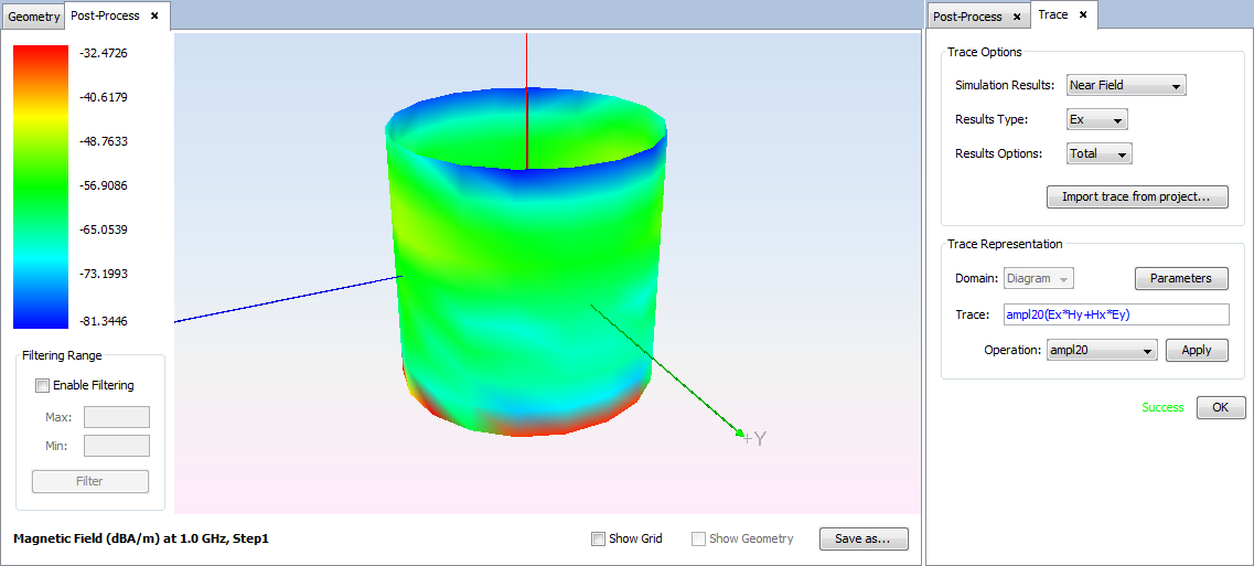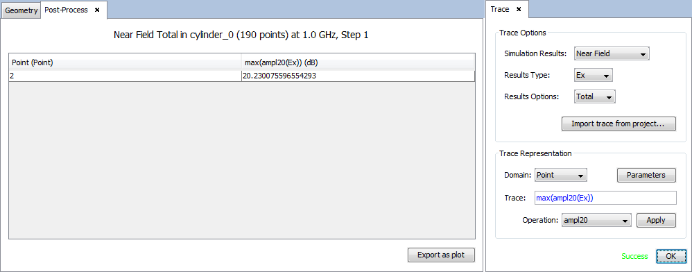 Select 'Show Results --> Post-Process' option to calculate the maximum field value of the plane observation. To see the result as a table, select 'table' on the selector of 'New Trace' option and click on 'OK' button.