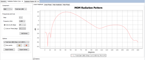 The radiation cuts can be visualized by clicking on Show Results - Radiation Pattern - View Cuts.