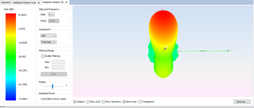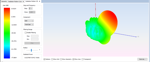 The radiation pattern can be visualized by clicking on Show Results - Radiation Pattern - View 3D Pattern.