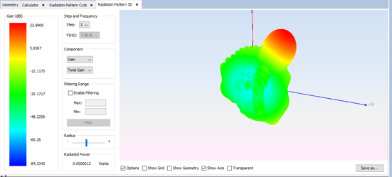The radiation pattern can be visualized by clicking on Show Results - Radiation Pattern - View 3D Pattern.