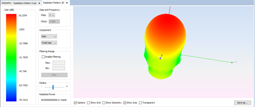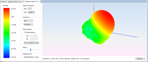 The radiation pattern can be visualized by clicking on Show Results - Radiation Pattern - View 3D Pattern.