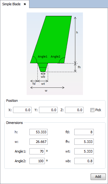 Select 'Source --> Primitive Antenna --> Coaxial Feed --> Blade --> Simple Blade' option and set the parameters as show the next figure. Then save the parameters and the antenna appears.