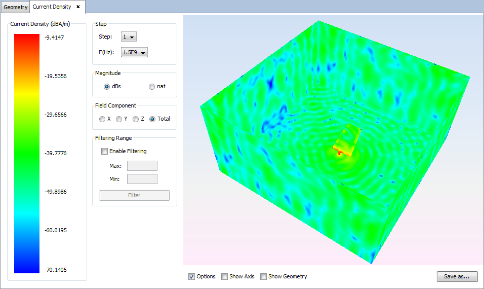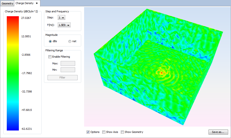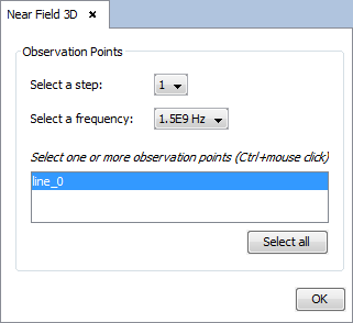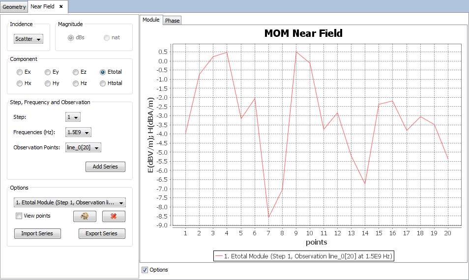 Selecting other values for incidence, component, step, frequency or observation parameters and clicking on 'Add Series' button a new cut will be added to the selected parameters. On 'Show Results --> Near Field' menu, other results are present such as 'View Cuts by Step' and 'View Cuts by Frequency' and this option display the values for one selected point for each step or frequency.