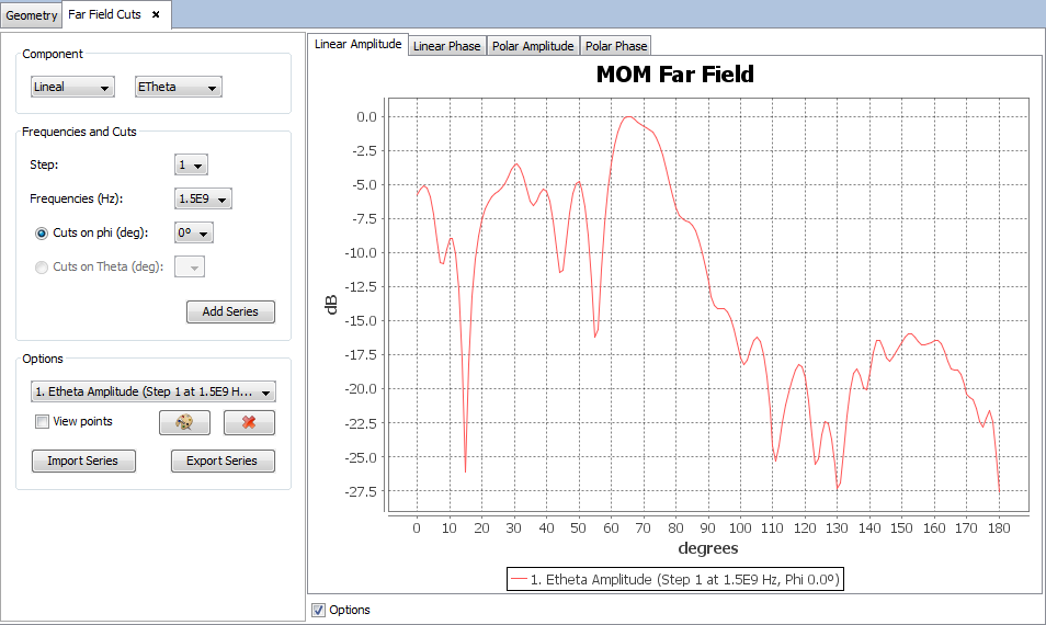 Selecting other values for the component, step, frequency or cut parameters and clicking on 'Add Series' button a new cut will be added to the selected parameters. On 'Show Results --> Far Field' menu, other results are present such as 'View Cuts by Step' and 'View Cuts by Frequency' and this option display the values for one selected point for each step or frequency.