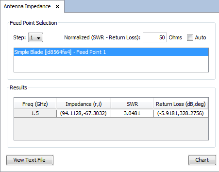 Select 'Show Results --> View Impedance' option to show the impedance values for the simulated coaxial feed.