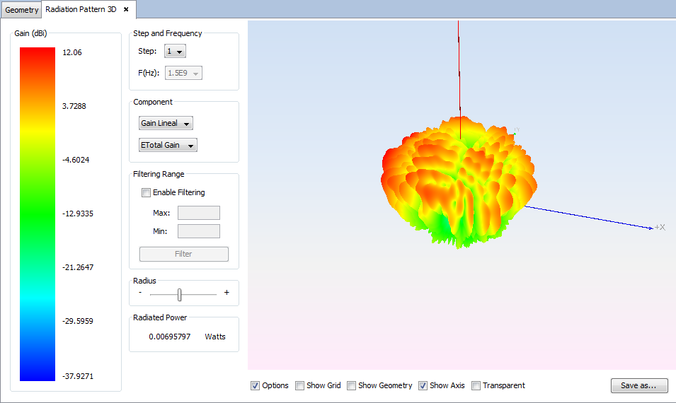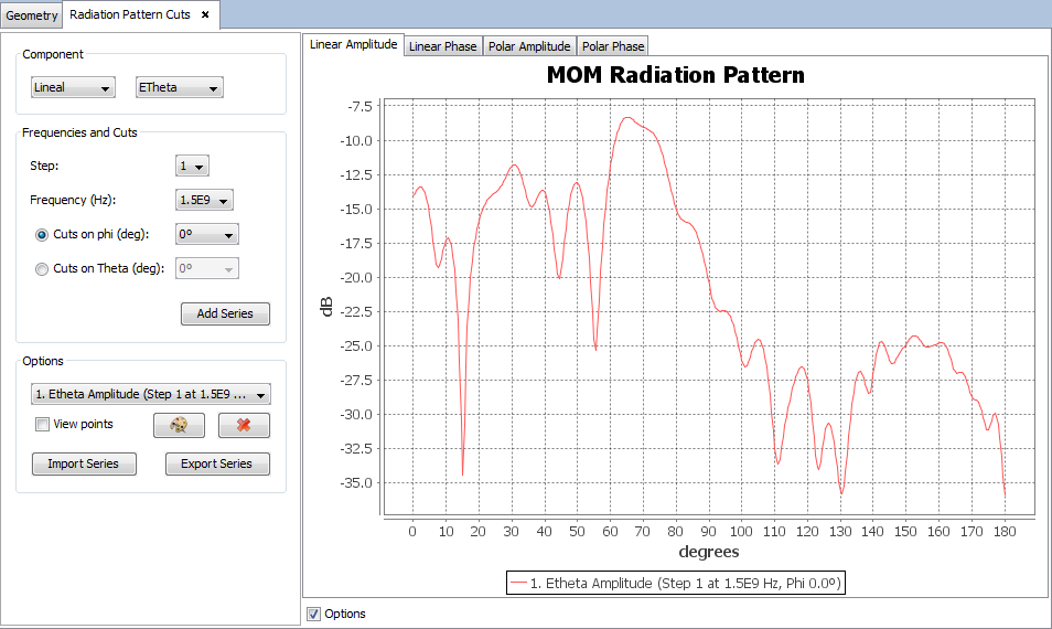 Selecting other values for the component, step, frequency or cut parameters and clicking on 'Add Series' button a new cut will be added to the selected parameters. On 'Show Results --> Radiation Pattern' menu, other results are present such as 'View Cuts by Step' and 'View Cuts by Frequency' and this option display the values for one selected point for each step or frequency.