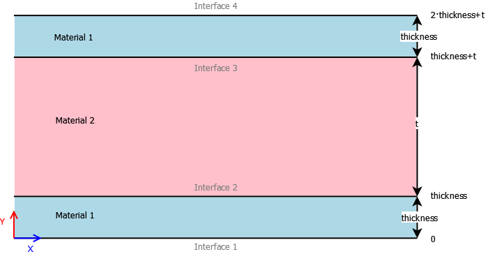 This document shows several examples for studying the thickness of a radome by using the parametric simulations. In particular, we are interested in studying the behavior of a radome with three layers, where the external ones are identical but the middle one has a different material and its thickness depends on the parameter t. This idea is shown in the bi-dimensional example of the figure below.