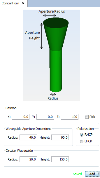 The radomes will be placed on the origin of coordinates to make easier its geometrical definition, so the horn is created 10 centimeters below it on the Z axis. Keep the most of parameters in the Conical Horn panel by default except the Z-Position that must be set to -100. Click on Add button to insert the horn before closing the panel.