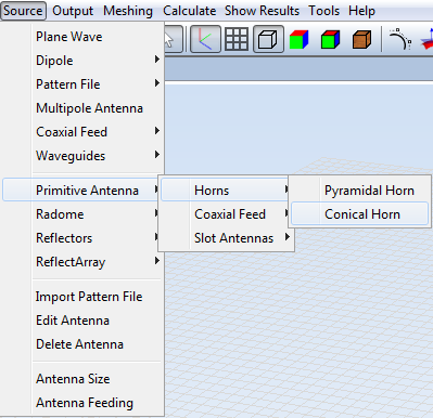 Insert a conical horn by using the existing primitives. To do that, click on Source – Primitive Antenna – Horns – Conical Horn menu and then the Conical Horn panel is open on right side of screen.