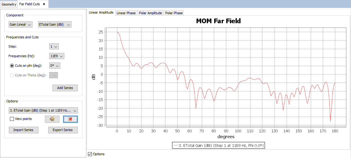 Select 'Show Results --> Far Field --> View Cuts' option to show the cuts of the observation directions options. Delete all series with the red cross button and select 'Gain Lineal' and 'ETotal Gain (dBi)' on 'Component' panel, then click on 'Add Series' button.