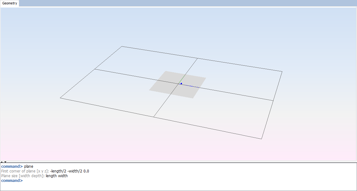 Generate a plane with a width of ‘length’ and a depth of ‘width’, with the first corner on -‘length’/2, -‘width’/2, 0; executing the 'plane' command writing it on the command line and sets the parameters when command line asks for it.