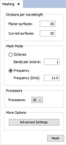 Select 'Meshing --> Parameters' to open the meshing configuration panel and then set the parameters as show the next figure.In this case, the number of division is selected by the case with the most accuracy of the databases compared to section Periodical Structures. The number of processors to be selected, to improve the efficiency on time, will be the number of the processors of the machine where the example will be executed.