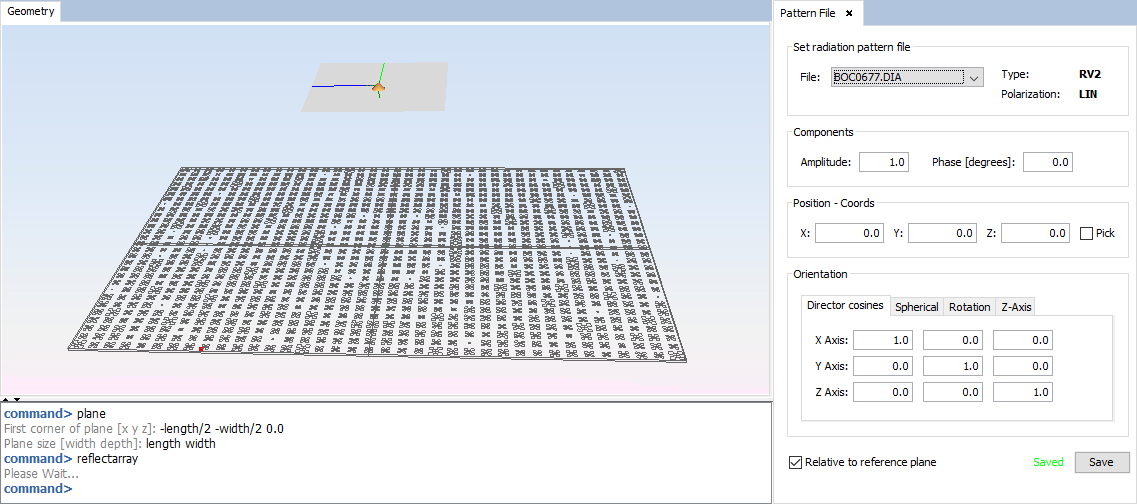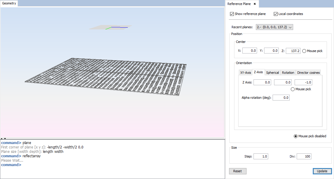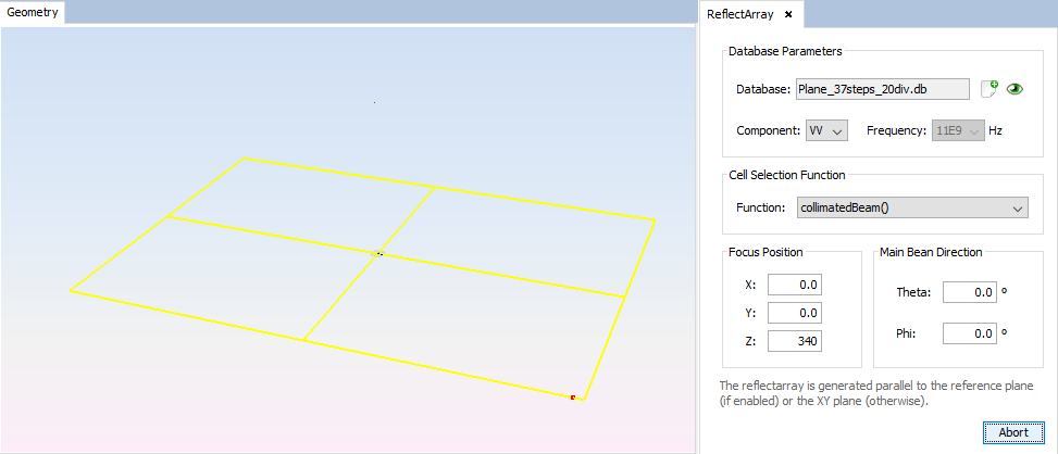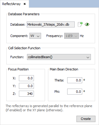 Select the plane previously created to generate the reflectarray on it. Then, click on 'Create' button and wait until the reflectarray layout is created.